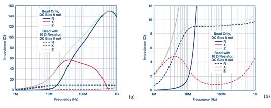 图8. (a) MPZ1608S101A ZRX曲线 (b) MPZ1608S101A ZRX曲线,缩放视图。
