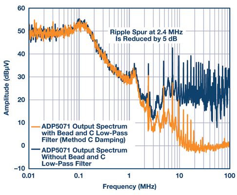 图9. 采用阻尼方法C时的ADP5071频谱输出以及磁珠和电容低通滤波器。