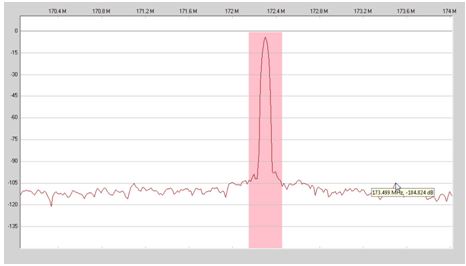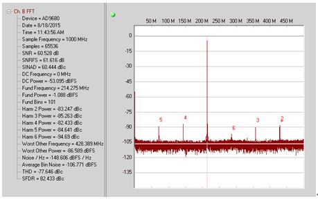 图6. 170 MHz输入时的1.2 MHz 边带开关杂散。杂散水平 = -105 dBFS。