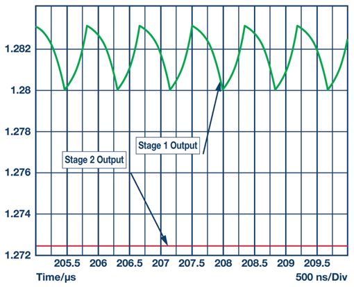图9 显示了第一级输出端的输出纹波以及电路第二级之后的滤 波输出,采用ADIsimPE 仿真。此处显示的纹波约为3 mV p-p。