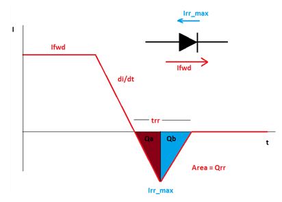 一个二极管中的反向恢复就是当反向电压被施加到端子上时流经二极管的反向电流(错误方向!)(请见图2)。二极管中有储存的电荷,这些电荷必须在二极管能够阻断反向电压前重新组合。这个重新组合是温度、正向电流、Ifwd、电流的di/dt,以及其它因数的函数。