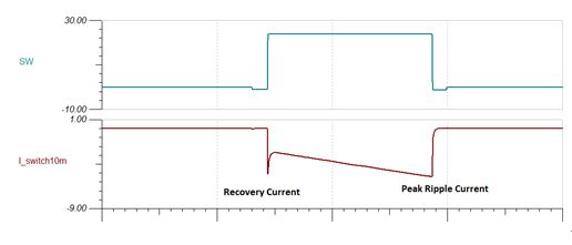 注意到大约5A的峰值纹波电路,以及5A峰值反向恢复电流加上开关节点电容充电电流。我运行了这个仿真,并且将温度从27°C增加至125°C—峰值恢复电流没有增加—并且看起来好像SPICE没有对这个恢复进行正确建模。
