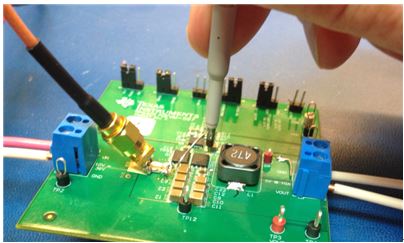 需要注意的一点是,当分流电阻器位于顶端时,这个示波器被接地至正输入电压轨。这意味着电源正输出被接地(负电源接至降压转换器),任何其它测试设备,比如说负载测试器,一定不能使流经示波器连线的电源短路。图6显示的是经修改的评估模块 (EVM) 电路原理图。