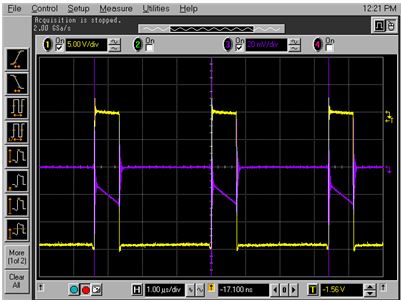 在图8中,黄色是软件节点,而紫色表示的是顶部FET漏极电流。电流平均值的“三角”波形与4A负载完美匹配 -> 20mV = 4A。