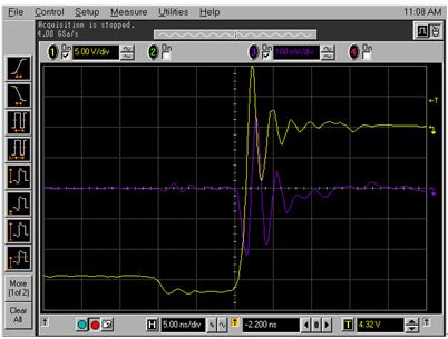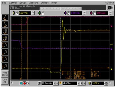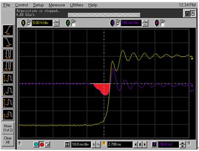 我将高/低驱动信号包括在内,作为参考(通道3&4)。这个“体二极管”传导比MOSFET的体二极管有更高的压降―我在这段时间看到的压降是2.5V左右,而不是大约0.6V。我抓取了这幅示波器波形图的原因在于,我将要在输入环路中增加一个会导致更多振铃的电阻器/电感。