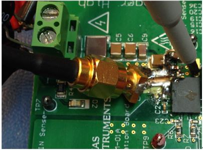 为了用一个硅MOSFET桥获得基线Qrr测量值,我掏出一把切割刀,在TPS40170EVM-597上为分流电阻器辟出了一个安全岛,并将这个分流电阻器放置其中。我使用的是一条50Ω SMA至BNC电缆,将信号传送到这个示波器(与50Ω的电阻值端接)。我串联了一个50Ω的电阻器,这样的话,我得到一半的信号值,不过没有振铃。注意在同时使用不同类型的探头时要进行失真调节!