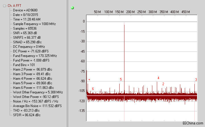图4. 170 MHz输入时的单音FFT,使用PDN #3。