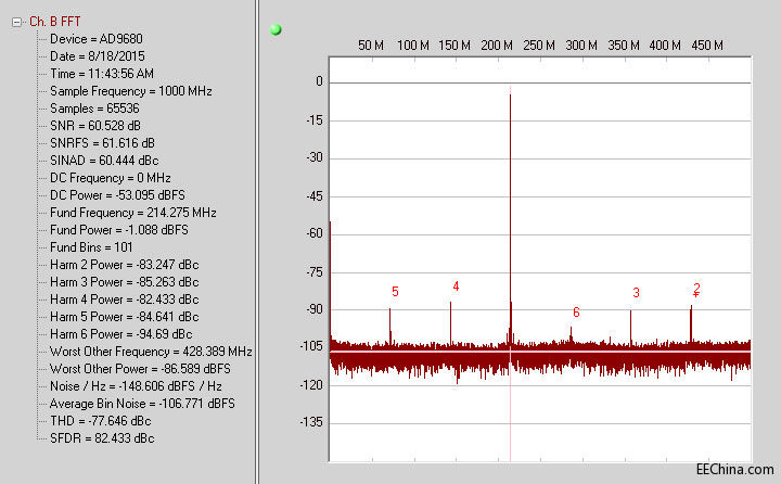 表2 和表3 分别显示了AD9680 使用各种PDN 的SNR 和SFDR 性能。根据AD9680 数据手册提供各种奈奎斯特区的前端网络和 寄存器建议设置。