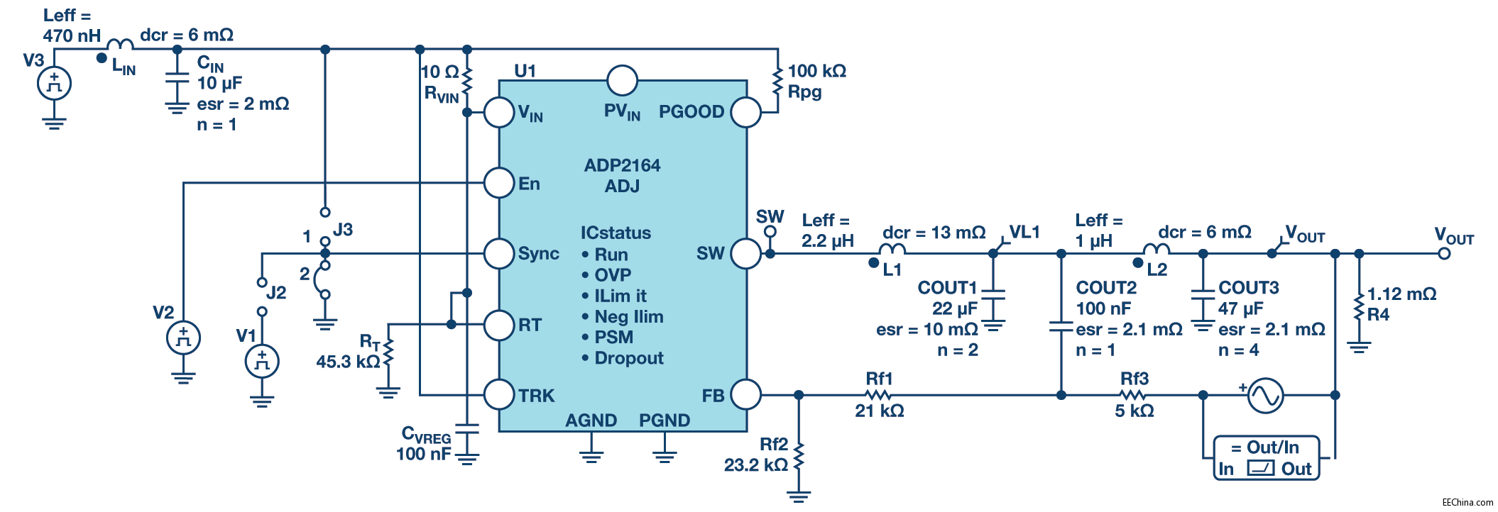 图8. ADP2164 驱动1.25 V 域的ADIsimPE原理图。