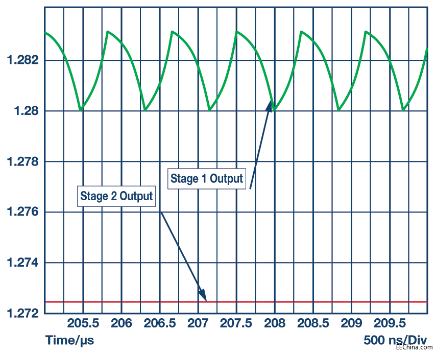 图9 显示了第一级输出端的输出纹波以及电路第二级之后的滤 波输出,采用ADIsimPE 仿真。此处显示的纹波约为3 mV p-p。