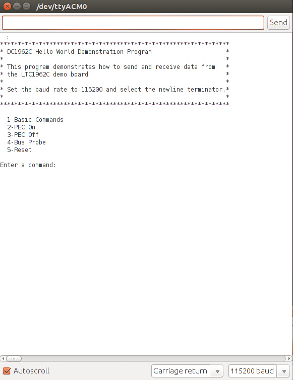 该 Sketch 示例采用一个 DC1962 和在第一节中提到的另一个硬件。此示例接受 5 个简单的命令: