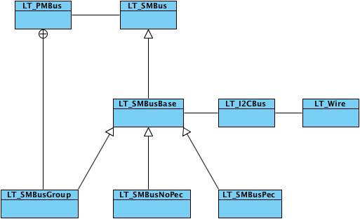 对于那些仅必须了解内部结构的编程人员来说,SMBus 位于一个层次体系中,这样一来应用代码就与接通和关断 PEC 无关,并可帮助移植。LT_I2C.h、LT_SMBus.h 和 LT_PMBus.h 形成了 API 的层。如欲移植 Linduino PSM 库,则可选择任何 API 之一并在您的平台上实施 (使用您自己的软件库)。最常用的端口重新实施 LT_SMBusBase 类,然后 PMBus 类正常工作,数学转换正常运行,而且所有其他的函数和示例正常运作。
