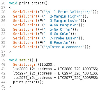 图 21 (读取电压) 示出了负责读取所有电压的代码。代码在情况 1 的内部示出。两个变量保持电压和页面:一个用于电压的 float,和一个用于页面的 unit8_t,显示在第 57~58 行。打印使用标准的 Arduino Serial.print… 函数。字符串周围的 F() 把它们放入闪存中,这样它们就不会使用宝贵的 RAM。对于每个器件,一个 for loop 通过调用 pmbus->setPage(…) 的页面进行检索,随后利用 pmbus->readVout(…) 以读取电压。接着,代码以十进制打印电压 (采用 DEC 类型)。
