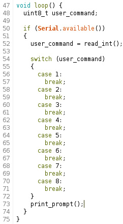 环路函数将处理用户输入。首先,它必须检查串行总线是可用的。然后,它必须把输入作为一个整数读取并将之传递至一个开关语句。在开关语句的内部,它必须执行某些函数并随后调用提示函数。用于每个命令的代码将在开关语句每种情况的内部编写,而提示函数将在之后调用。您的代码框架应看上去与图 20 (用户输入) 相似。