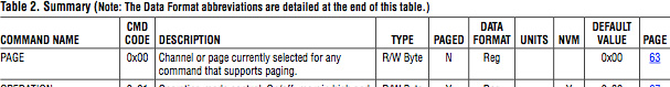 LTC3880 产品手册中的表 2 示出了 PAGE 命令。这张表是对 Beagle 数据进行解码的快速方法。请注意 Type 列显示的是 R/W Byte。这意味着寄存器是读 / 写字节协议,因此两个方向均得到支持。