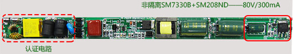 [size=12.6316px] 图中红色实线框外的为单级高功率因数有频闪的电路(我司的SM7330B),红色实线框内为“消除频闪电路”,即:SM208ND及其外围器件整体图。