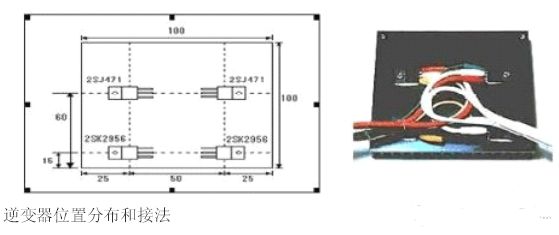 电路板见图6。所用元器件可参考图7。逆变器用的变压器采用次级为12V、电流为10A、初级电压为220V的成品电源变压器。P沟道MOS场效应管(2SJ471)最大漏极电流为30A,在场效应管导通时,漏-源极间电阻为25毫欧。此时如果通过10A电流时会有2.5W的功率消耗。N沟道MOS场效应管(2SK2956)最大漏极电流为50A,场效应管导通时,漏-源极间电阻为7毫欧,此时如果通过10A电流时消耗的功率为0.7W.由此我们也可知在同样的工作电流情况下,2SJ471的发热量约为2SK2956的4倍。所以在考虑散热器时应注意这点。图8展示本文介绍的逆变器场效应管在散热器(100mm×100mm×17mm)上的位置分布和接法。尽管场效应管工作于开关状态时发热量不会很大,出于安全考虑这里选用的散热器稍偏大。