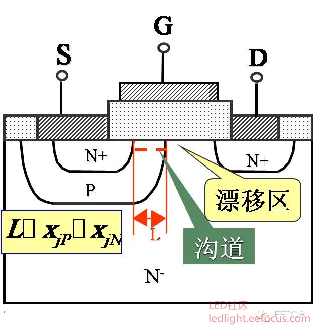 为了等一下便于理解IGBT,我还是先讲下Power MOSFET的结构。所谓功率MOS就是要承受大功率,换言之也就是高电压、大电流。我们结合一般的低压MOSFET来讲解如何改变结构实现高压、大电流。