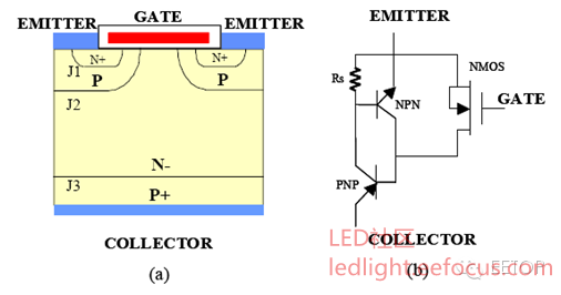 上面介绍了Power MOSFET,而IGBT其实本质上还是一个场效应晶体管,从结构上看和Power MOSFET非常接近,就在背面的漏电极增加了一个P 层,我们称之为Injection Layer (名字的由来等下说).。在上面介绍的Power MOSFET其实根本上来讲它还是传统的MOSFET,它依然是单一载流子(多子)导电,所以我们还没有发挥出它的极致性能。所以后来发展出一个新的结 构,我们如何能够在Power MOSFET导通的时候除了MOSFET自己的电子我还能从漏端注入空穴不就可以了吗?所以自然的就在漏端引入了一个P 的injection layer (这就是名字的由来),而从结构上漏端就多了一个P /N-drift的PN结,不过他是正偏的,所以它不影响导通反而增加了空穴注入效应,所以它的特性就类似BJT了有两种载流子参与导电。所以原来的 source就变成了Emitter,而Drain就变成了Collector了。
