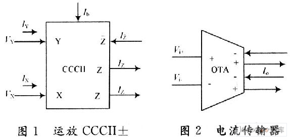 跨导运算放大器CCCII士和电流传输器MO-OTAS电路符号及原理如图1,图2所示。