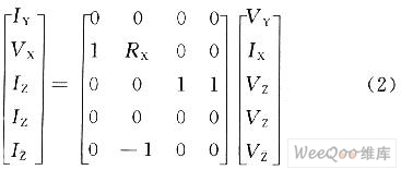 式中:Io是输出电流;Vd是差模输入电压;gm是开环增益,称为跨导增益,它是外部控制电流Ib的函数。CCCII±的端口特性由下列混合矩阵方程给出: