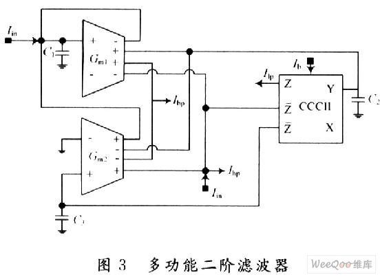一种将MO-OTAS和CCCII±相结合所得到的双二阶滤波器如图3所示。其中,Iin为输入电流;Ilp,Ihp,Ibp分别为低通、高通、带通输出函数。该电路的有源器件在输入端输入信号时,在输出端通过电流镜技术可以获得多个输出,而且由于输出端的高阻抗,可以将各个输出端任意组合而得到二阶陷波和全通函数。