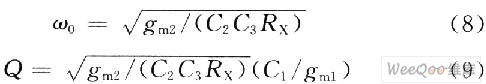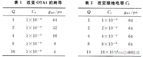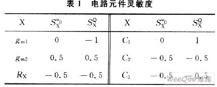得到的中心频率ω0和品质因数Q相对于电路中的各元件(RX,C1,C2,Gm)的灵敏度如表1所示。