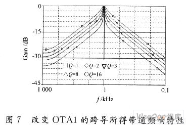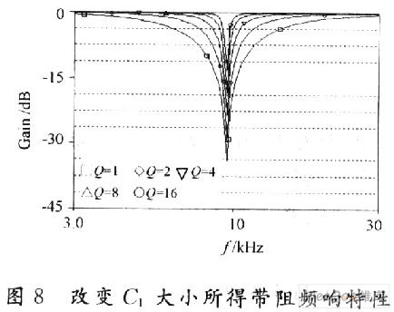 为了简化分析式(8),式(9),这里假设gm1=gm2=gm,而且C2=C3=C,当调节C1或gm1的数值时,可以看见Q在随其变化,而ω0仍然保持不变。可见,滤波器的特征频率和品质因数可以独立进行调节。