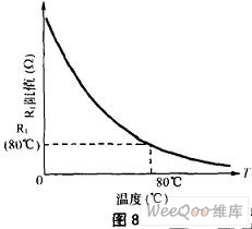 从图7可看出,要改变阈值温度TTH十分方便,只要相应地改变VTH值即可。VTH值增大,TTH增大;反之亦然,调整十分方便。只要RT确定,RT的温度特性确定,则R1、R2、RP可方便求出(设流过RT、R1及R2、RP的电流各为0.1~0.5mA)。