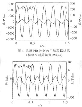 从运动控制器的软硬件结构可以看出,这种设计具有比较好的开放性,便于在软硬件方面进行功能扩展和重新配置,同时应用系统的构造也比较灵活。图3为开放式运动控制平台应用于伺服电机控制的结构图。它由三部分组成:采用PENTIUM200 CPU的IBM PC机;四轴开放式运动控制器;交流伺服电机和驱动器(采用松下MINAS-A系列100W伺服驱动器;位置伺服控制周期分别为250us和1ms)。图4和图5分别是不同伺服控制周期时位置控制器采用PID控制算法的正弦位置跟踪曲线,其中,θr表示幅值为2500个脉冲、频率为4Hz的正弦给定信号,θf表示实际位置反馈,E表示位置跟踪误差。结果表明,系统可以方便地实现控制设置,具有较强的软件扩展能力。