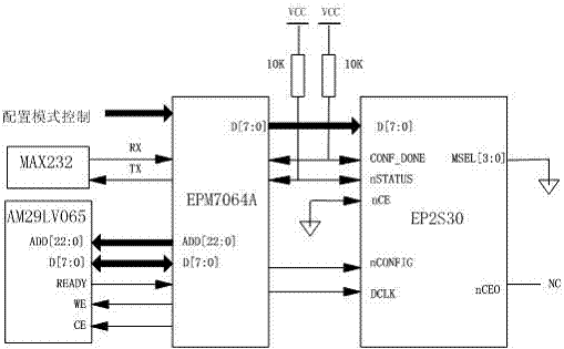 系统的关键部件为一片高档密度FPGA EP2S30,其要求的一次配置数据达1.205MBytes,故其配置采用“Flash存储器+CPLD主控器”的方案。