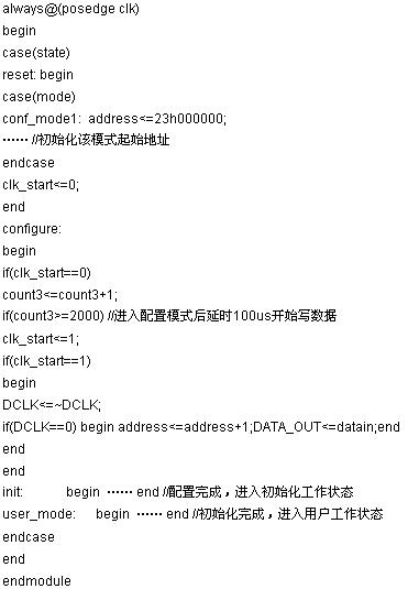 程序代码在QUARTUSⅡ6.0下的仿真时序如图3所示。其简要工作过程是,外部conf_start信号启动一次配置,EPM7064A将nCONFIG和nSTATUS信号拉低,FPGA进入复位状态,根据mode取得相应的Flash初始地址,复位完成FPGA将nSTATUS释放,延时大约100us后EPM7064开始给FPGA提供时钟和数据,直到将配置数据全部写入FPGA,配置完成后FPGA将CONF_DONE释放,表明配置完成,FPGA进入初始化状态,经过内部初始化后,INIT_DONE变高,表明FPGA进入工作状态,各引脚将根据用户定义的状态工作。若配置过程中nSTATUS被FPGA拉低,则表明有配置错误,重新进行配置,在任何工作状态下外部指令都可以再次启动配置。