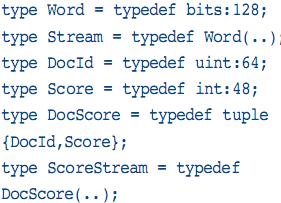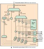 通过将文档表述为“词袋”,文档流就是文档 ID、文档词对组 (document term pair set) 等对列表。从物理上说,FPGA 以每秒 1.6 GB 的速度从 NUMAlin 接受 128 位字流。因此,文档流必须在字流上编码。可将文档词对 di =(ti,fi) 编码为 32 位:24 位用于词 ID(支持 1,600 万个词的词汇库),8 位用于词的频率。这样,我们就能将 4 个对组合到 128 位字中。要标示文档的起点与终点,我们需要插入包含文档 ID(64 位)和标志符(64 位)的报头与脚注字 (footer word)。