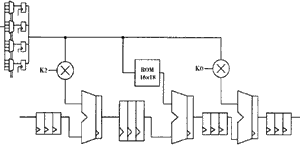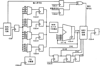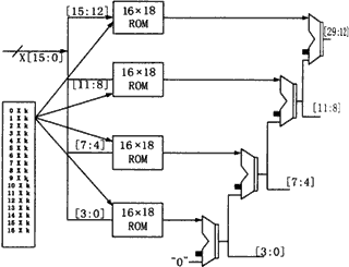 在这种结构中,时钟是f1,内部操作的时钟是4×f1,其中的4个多路复用器每次可以从16路信号中选出4位用作ROM的地址线。每次4位地址线从ROM中读出数据,经过相应的移位相加即可,两位计数器用来控制这些多路复用器的输出。