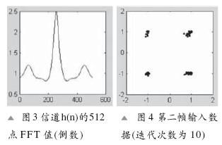 图3和图4分别是信道h(n)的FFT值(倒数)和第二帧输入数据(迭代次数10)。
