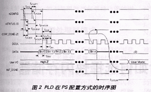 ALTERA公司生产且具有ICR功能的PLD器件有FLEX6000、FLEX10K、APEX和ACEX系列,它们的配置方式可分为PS(无源串行)、PPS(无源并行同步)、PSA(无源并行异步)、PSA(无源串行异步)和JTAG(Joint Test Action)等四种方式,在这四种方式,PS方式因PLD与配置电路的互连最简单,对配置时钟的最小频率没有限制而应用最广泛,因此在图1介绍的ICR控制电路中也采用PS配置方式来实现ICR功能。图2是PS配置方式的时序图。