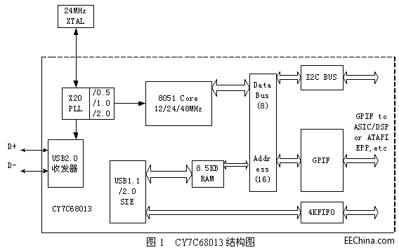 1.2结构CY7C68013结构图如图1所示。它有三种封装形式:56SSOP,100TQFP和128TQFP。