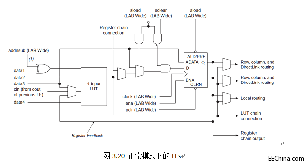 通常MAX II器件的LEs结构在实际应用中为了达到功能的最优化,会被作为正常模式(Normal Mode)或动态算术模式(DynamicArithmetic Mode)使用。两种模式对LEs资源的使用有所不同,总之大家记住一个点,加减等运算用算术模式实现是最佳的选择,其他情况下一般是正常模式来实现,而到底用哪种模式来实现也不用设计者操心,Quartus II软件会自动判断和优化,咱只要知道有这么一回事就好。我们看图3.20,这是正常模式下的LEs结构,相比于完整的LEs结构,少了好多功能块。