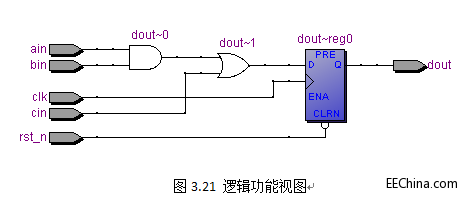看不懂不要紧,咱还没开始学语法呢。这个电路中,输入信号ain、bin和cin,复位信号rst_n,时钟信号clk,输出信号dout。输出信号dout在复位信号rst_n有效时输出为0,在撤销复位(rst_n = 1)后每个时钟上升沿锁存当前的最新值,这个最新值为当前输入信号ain与bin再或cin的结果。其逻辑功能如图3.21所示,是一个典型的时序逻辑,这个电路中有我们前面提到的与门、或门和寄存器等基本组件。
