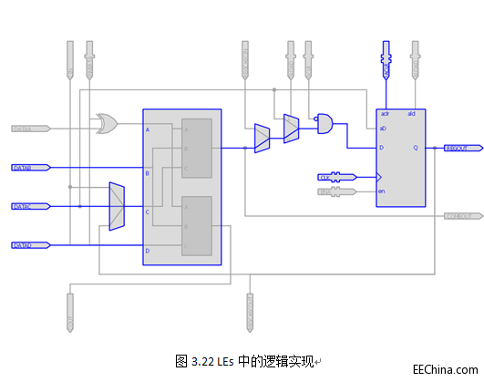 再看经过Quartus II工具的“翻译”后,前面这段逻辑被映射到了MAX II的LEs中,和图3.20相比较,可以确认这是LEs的正常模式,图中高亮部分是被“编程”开启功能的电路实现。不要感到稀奇,这个原本要实现与门、或门等逻辑功能的电路却不是用与门、或门来实现的,而是我们前面提到的LUT在这里扮演了很重要的角色。有人可能又要纳闷了LUT到底为何物?有那么神通广大么?别说,还真那么回事。就拿4输入的LUT来说,其实它里面就相当于一个16bit的存储器,或者你也可以理解LUT里面存放着4个输入信号的真值表,输入信号通过这个真值表便可得到期望的结果,就如我们这个实例一样。