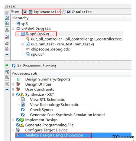 如图所示,在“Design à Implementation”界面下,首先选中“Hierarchy”下的“sp6.v”文件,接着双击“Processes: sp6”下的“Analyze Design Using ChipScope”。
