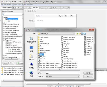 打开我们之前硬件系统的sopc builder,双击左上角的NEW component ,在HDL file一栏中添加我们的adc.v文件,