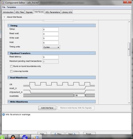 在signal一栏中,根据端口的类型配置端口,时钟复位信号不用说,其中我们的与总线接口部分的端口属于总线的从机端口,我们需要把它定义为avalon_slave_0端口类型,信号类型设置为低电平片选,低电平读就好,其他端口设置为conduit类型,信号类型设置为export,因为我们是用来输出到外部器件的端口