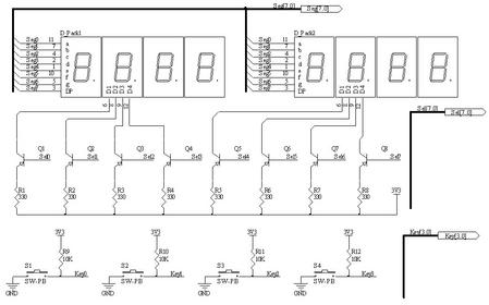 本实验硬件电路简单,用到了8个数码管和4个独立按键。硬件电路如下: