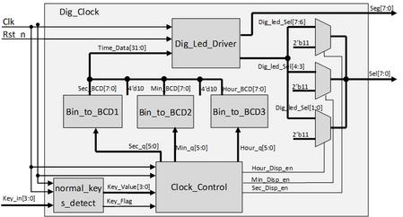 通过对系统时钟进行计数,获得1S的标准信号,再以该信号为基础,进行时、分、秒的计数,通过数码管将该计数值显示出来,即可实现数字钟的功能。同时可以使用独立按键对时、分、秒计数器的初始值进行设置,即可实现时间的设定。