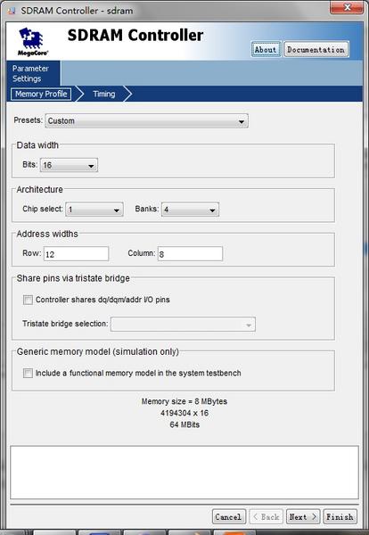 然后我们可以配置SDRAM,即我们的内存,SDRAM的配置参数是按照我们板子上芯片的具体参数配置的,由于系统提供的SDRAM芯片跟我们不匹配,所以我们用custom手动配置