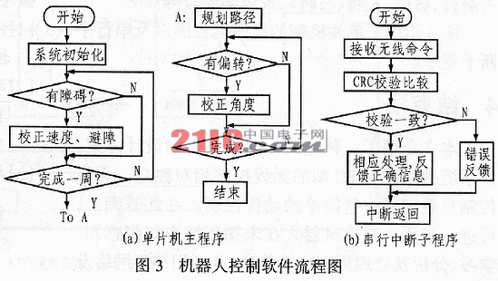 系统软件根据任务不同一般会有所差别。本系统软件在启动后先初始化,然后通过红外传感器以及霍尔元件等传感器将环境循环扫描一周。需指出的是,完成一周需要有传感器信号来指示,然后才能遍历实验环境,遍历环境采用先横向走遍整个环境,再纵向遍历的方法。在无线控制信息时,系统将通过中断进行相应处理。机器人还可以通过传感器实现循迹(黑线)行走和寻找光源等功能。在PC端,用VB编的一个简单的机器人控制界面可非常方便的设定机器人的平移速度和旋转速度,实时控制机器人前行、后退、左转、右转以及运动停止等。