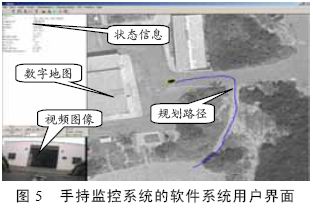 该手持监控系统已应用到履带结构便携式移动机器人实验平台。在室外实验场地测试取得较好的效果,测试过程中软件系统用户界面如图5。用户界面分为三部分:机器人自身状态信息显示、视频图像数据显示、数字地图显示。