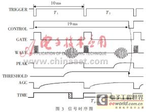 整个电路的时序由TRIGGER信号控制。CONTROL信号由TRIGGER信号负跳沿触发,它把触发周期T1和T2合并为一个检测周期,这样是为了达到可变阈值检测的目的。其中,T1为精密峰值检测周期,T2为可变阈值检测周期。GATE信号是为了屏蔽虚假接收波。WAVE信号为超声波发射及接收信号。发射的脉冲数应选择合适,脉冲个数多有不少优点:脉冲能量大,受其它声波模式影响较小等;但脉冲个数多,盲区大,且余振波头也多。通过实验,取4个脉冲。PEAK信号是精密峰值信号,由积分充电电路得到。由于接收波随距离增加迅速衰减,为了使接收波的幅值不随测量距离的变化而大幅度地变化,采用可变增益控制(AGC)技术,有利于获得精确的距离信息。