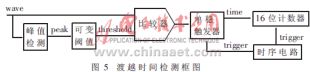 THRESHOLD信号为自适应可变阈值信号,它反映前一周期接收波信号的幅值大小。相邻两个接收波信号的峰值相差不大,将T1周期得到的精密峰值乘以一个比例因子,得到THRESHOLD信号,作为T2周期的阈值,和WAVE信号相比较,保证每次在同一个接收波头(在本系统中,n=4)后开始封锁计数器,获得渡越时间(如图4和图5),从而不受接收波幅值大小的影响,提高了测量的精度。